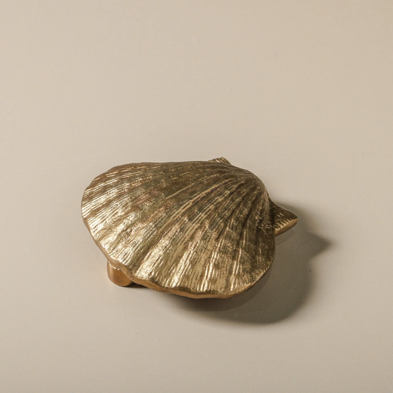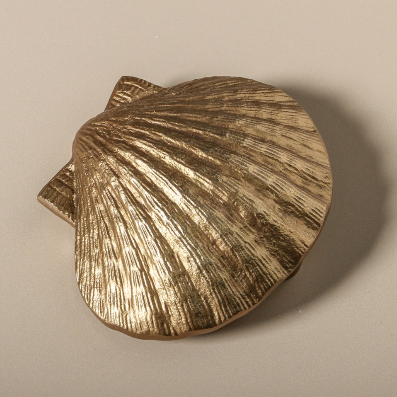 This door knocker, expertly forged from iron and finished in antique brass, features a distinctive clam shell design. Its robust construction ensures durability while the unique shape adds an elegant, timeless touch to any entryway, blending classic appeal with functional reliability.
