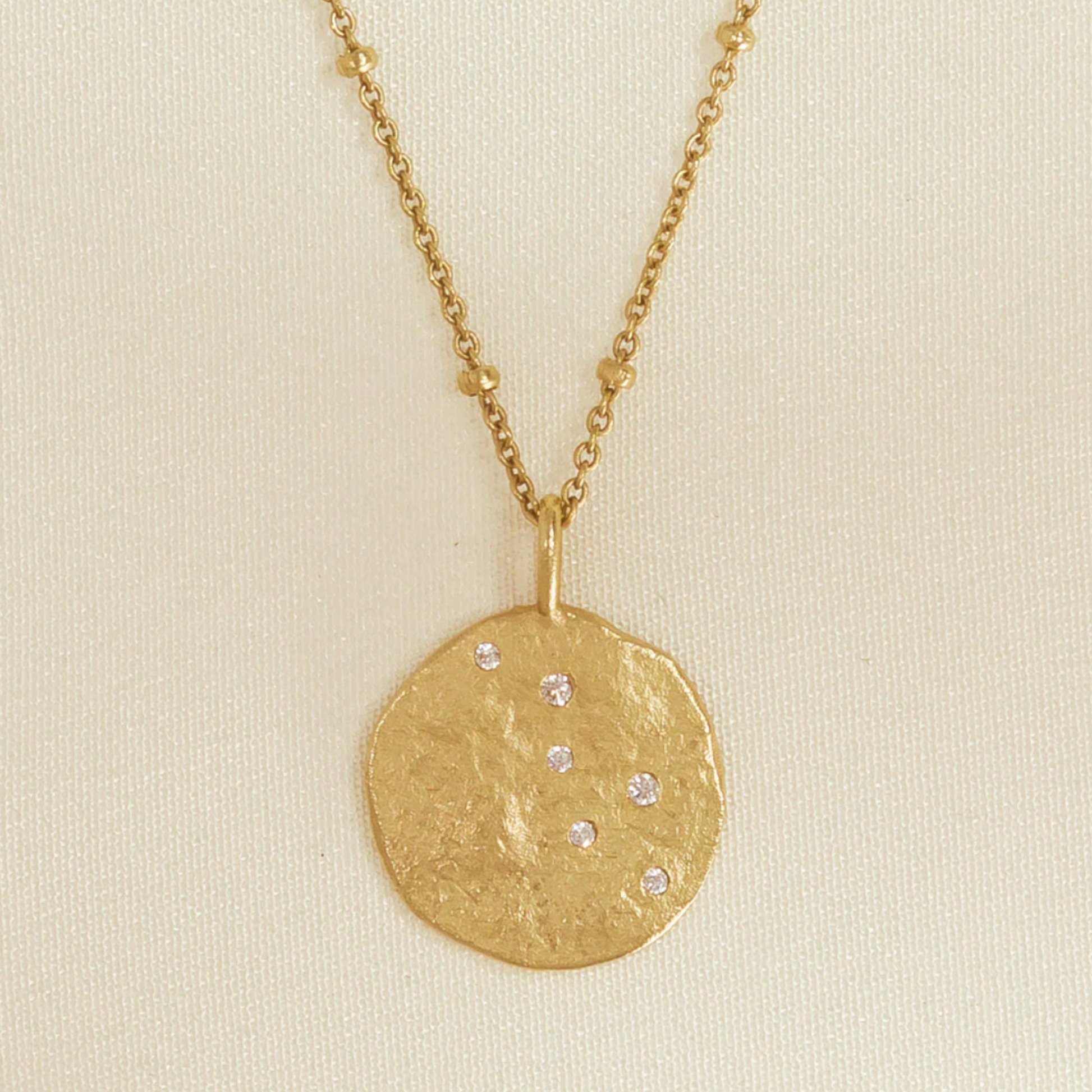 Embrace the timeless elegance of our Lumoria pendant - a stunning round, golden disc encrusted with sparkling white stones. Inspired by ancient coins, it adds a touch of luxury and sophistication to any outfit. Shine like the stars in a midnight sky with this truly unique piece.